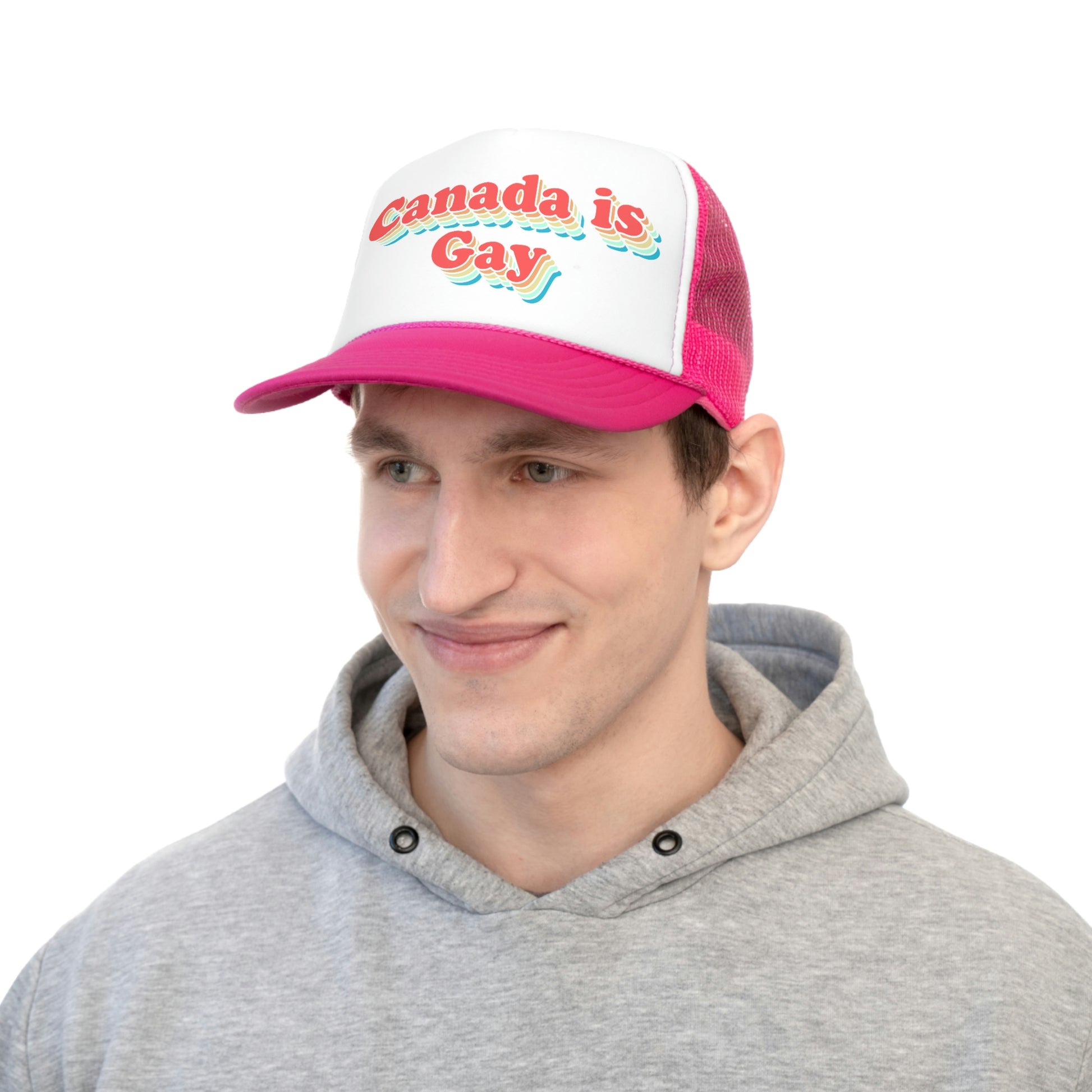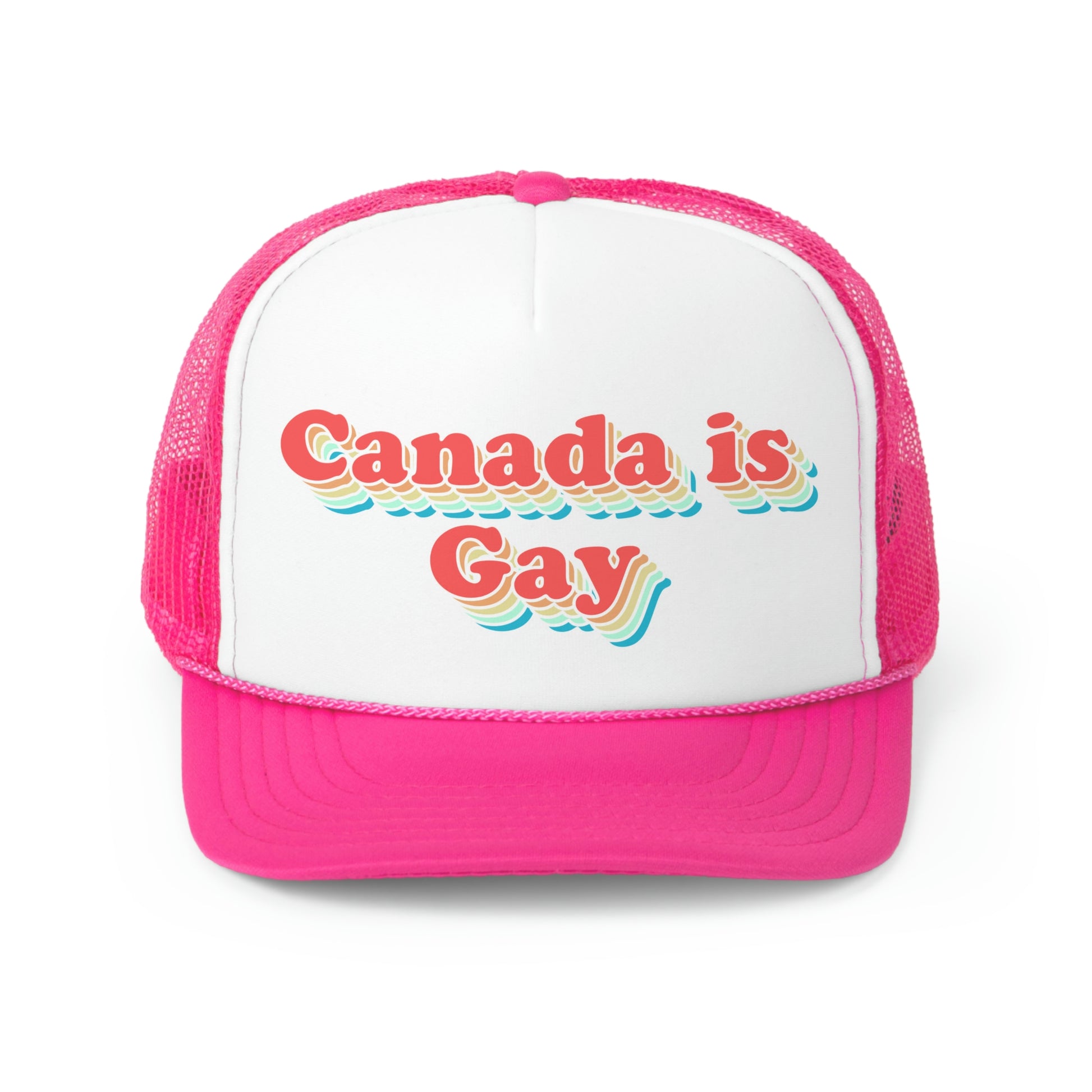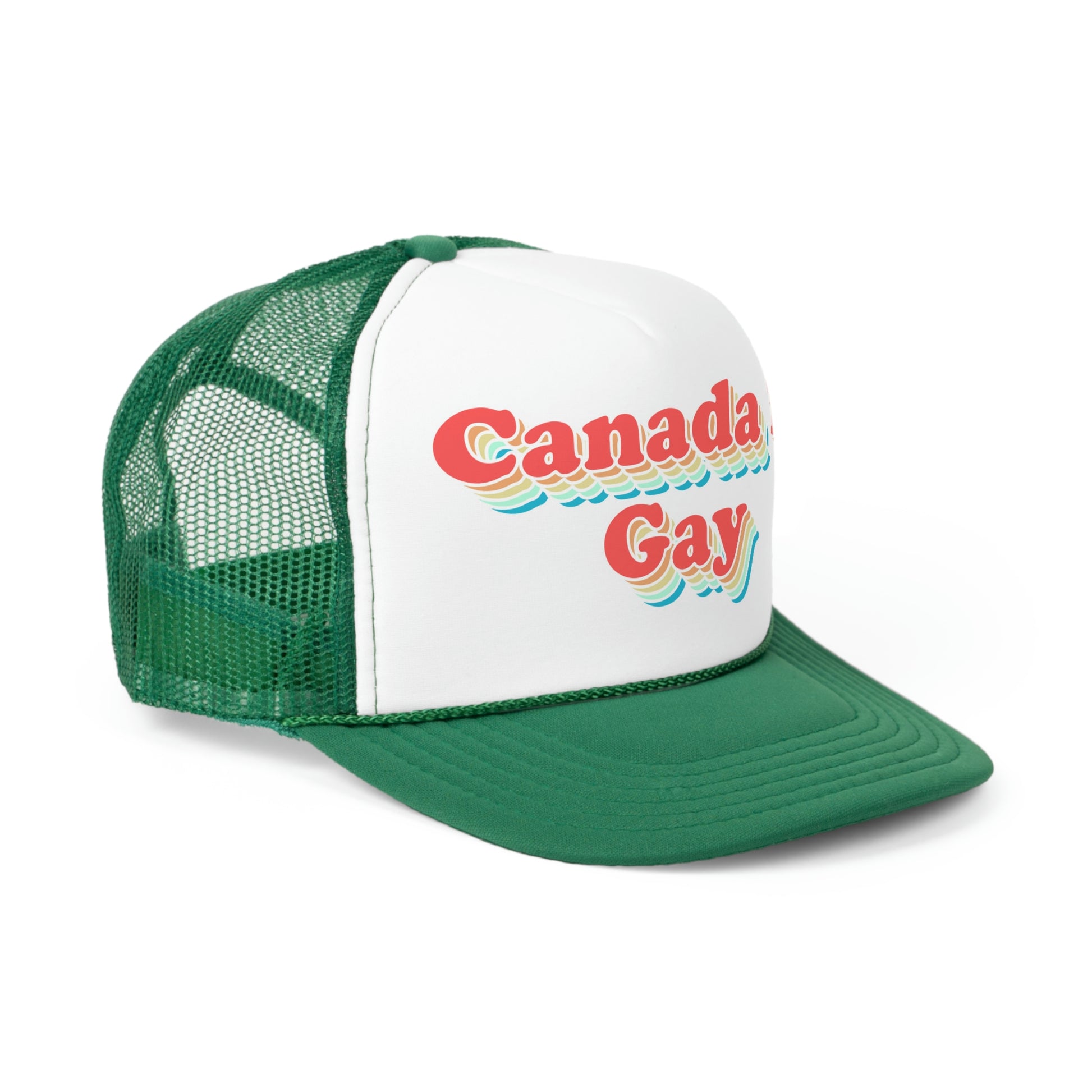 We're gay, eh! This old-school 70's design is a bit trippy, psychadelic, and very, very cool. Show your Canadian pride (or just your pride!) with this colourful trucker hat! Canada's gay in the best way.